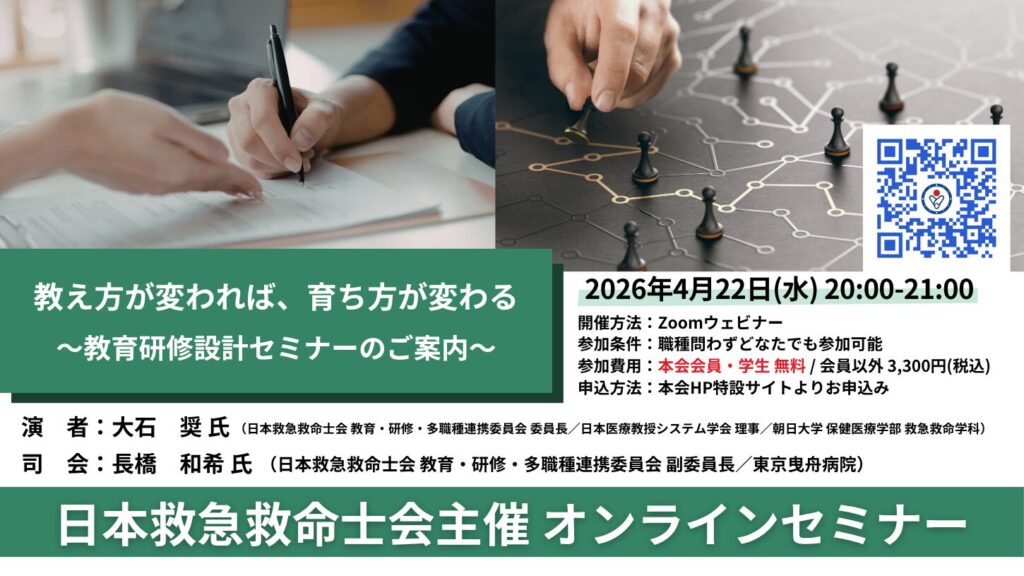今回のオンラインセミナーでは、日本救急救命士会が今後開催する「教育研修設計セミナー」の概要をご紹介するとともに、教育研修を設計するうえで大切なエッセンスをわかりやすくお伝えいたします。これまでに「教え方が上手だ」と感じた方はいませんでしたか。その実践は、教育設計の理論によって裏付けることができます。