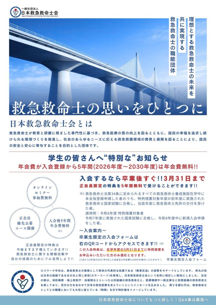 (一社)日本救急救命士会では、救急救命士国家資格取得後5年間の年会費を5年間免除ならびに入会金納入を入会登録後6年目4月に納付いただく「新規入会に関する特例措置」を設けております。